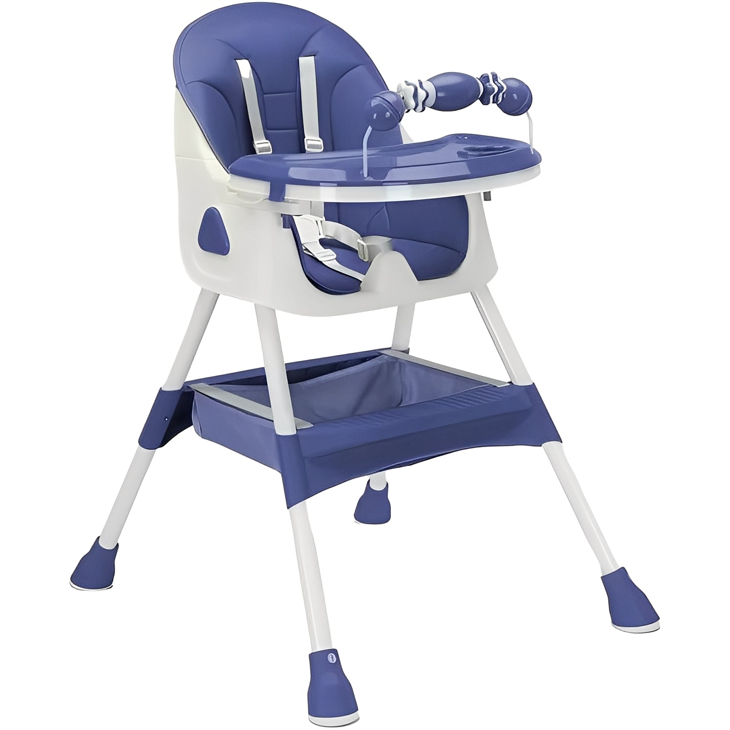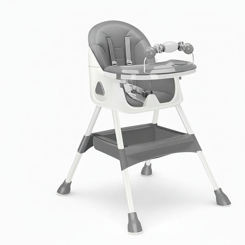 This chair uses a stainless steel frame and a base shaped to encourage balanced placement during use. Non-slip feet are included to help reduce movement on common indoor floor surfaces. A five-point harness is provided to support secure seating for the child.