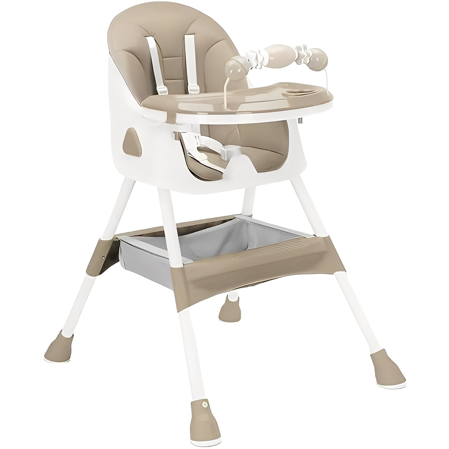 The two layer food tray has three adjustable positions. The chair can be reconfigured from a high-chair setup to a lower toddler seat, allowing for different stages of use.