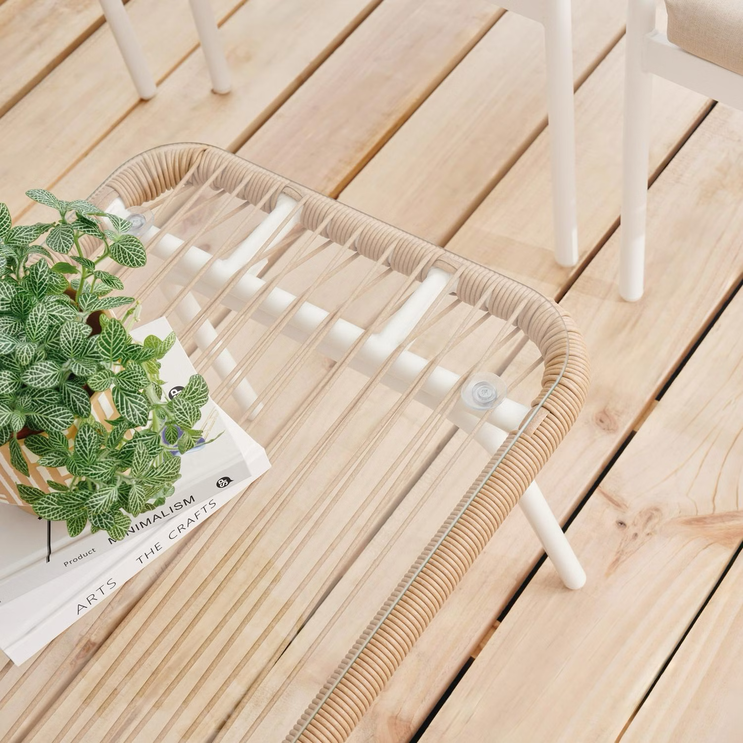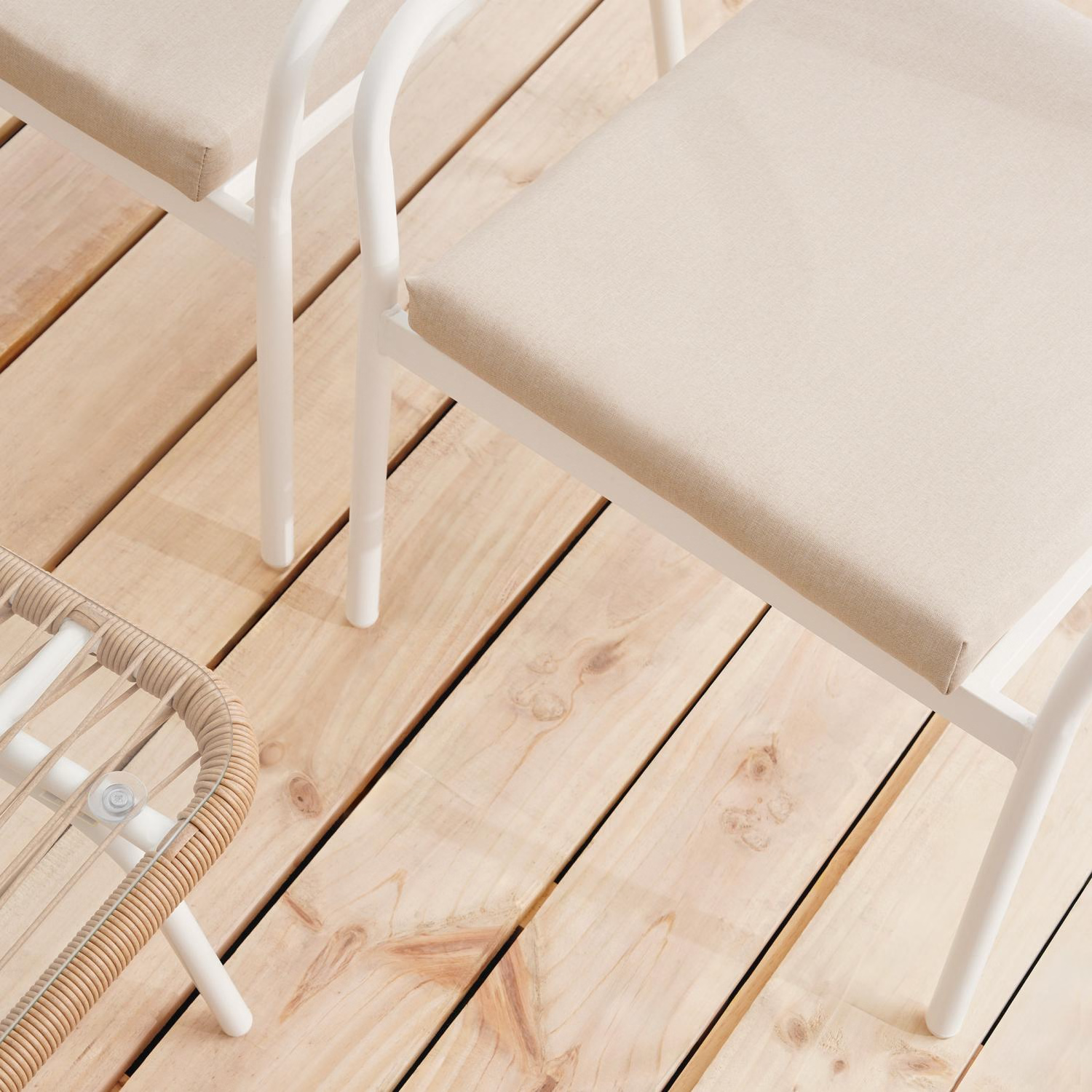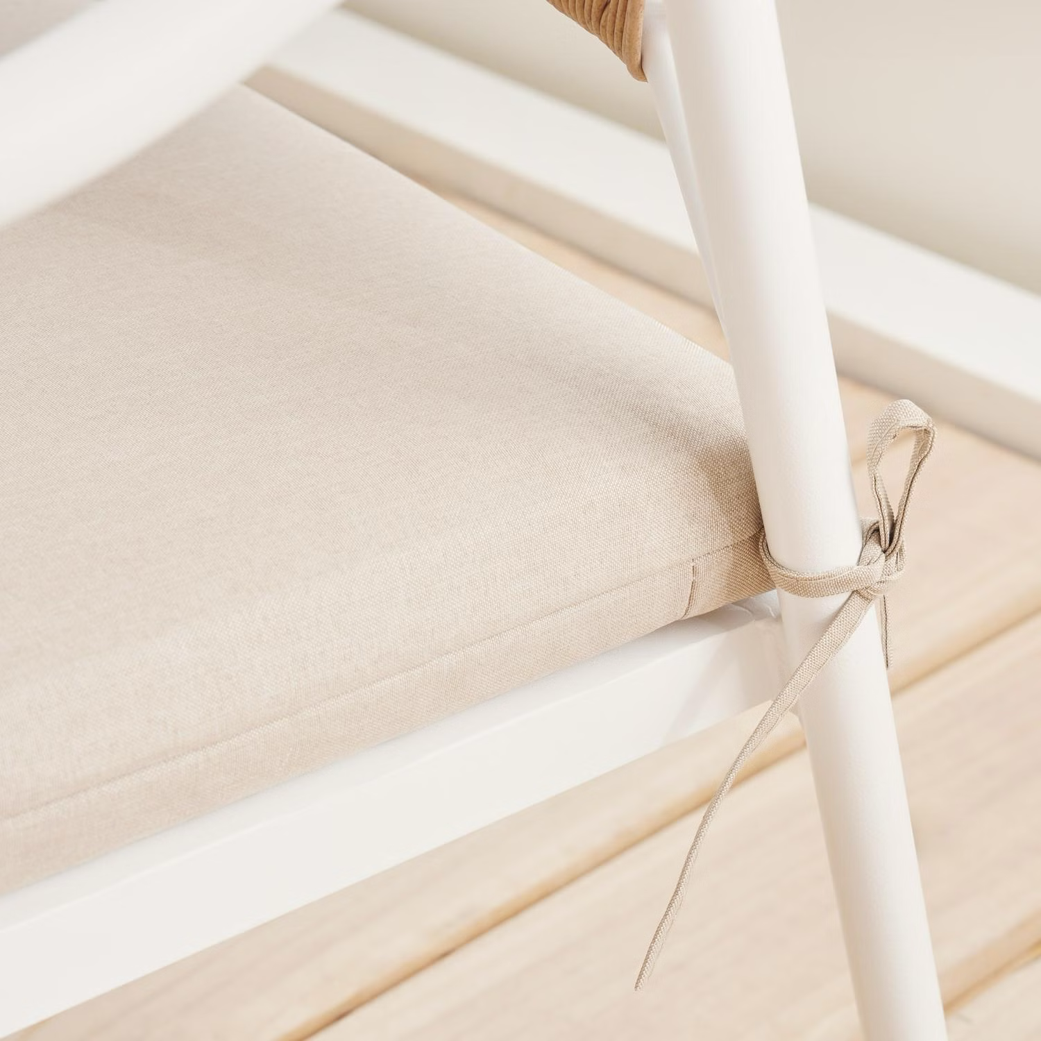 The combination of handwoven rattan and soft beige cushions creates a warm, neutral aesthetic that blends easily with most outdoor décor.