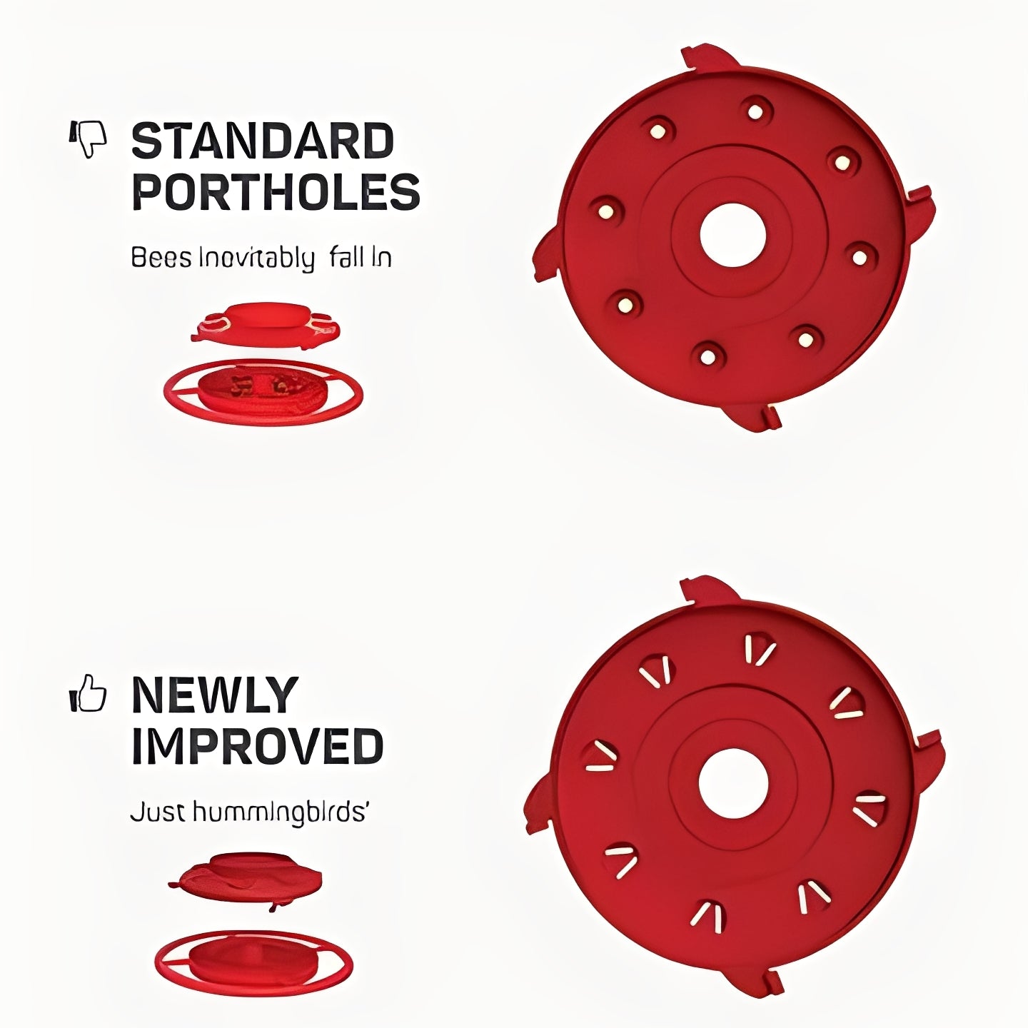 The device includes two features for deterring insects. An ant moat is integrated into the top, which can be filled with water. The base designed with small openings that may help limit bee entry. An s-shaped hook and hanging string are included for setup. The reservoir screws into the base as part of the design.
