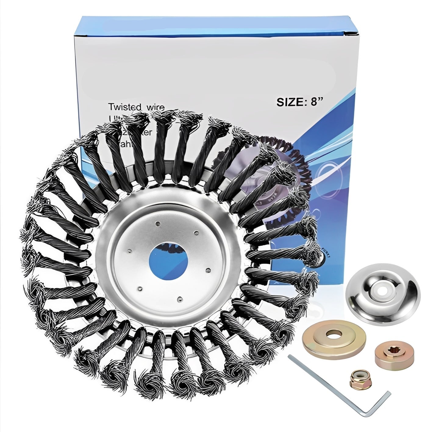 The brush head is constructed from carbon steel wire and includes a center mounting hole with a diameter of up to 1 inch. It is designed to be compatible with many trimmer models that support this mounting size. Compatibility may vary by brand and model, and users should confirm fit before installation.