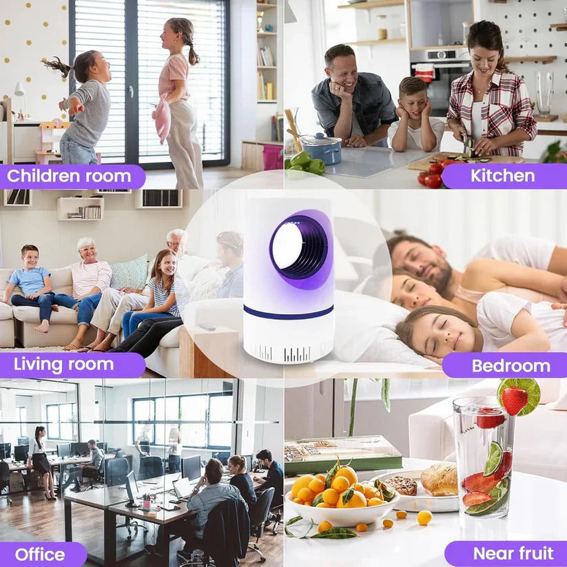 This UV light insect trap is designed to attract flying insects using a purple UV light source around 368nm. The light is intended to draw insects toward the unit, where an internal fan helps guide them into a contained chamber. The device uses airflow rather than electric zapping, offering an alternative approach to managing flying insects.