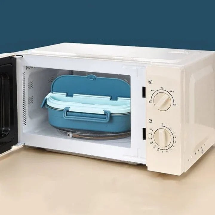 The interior is divided to keep different dishes separate, including space for a small soup bowl. The lid includes a sealing strip and four snap buttons that help keep the contents secured during handling.