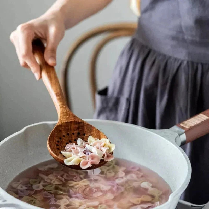 Teak wood naturally resists stains, odors, and heat. The utensils handle high cooking temperatures without warping, and cleanup is simple with warm water and mild soap.
