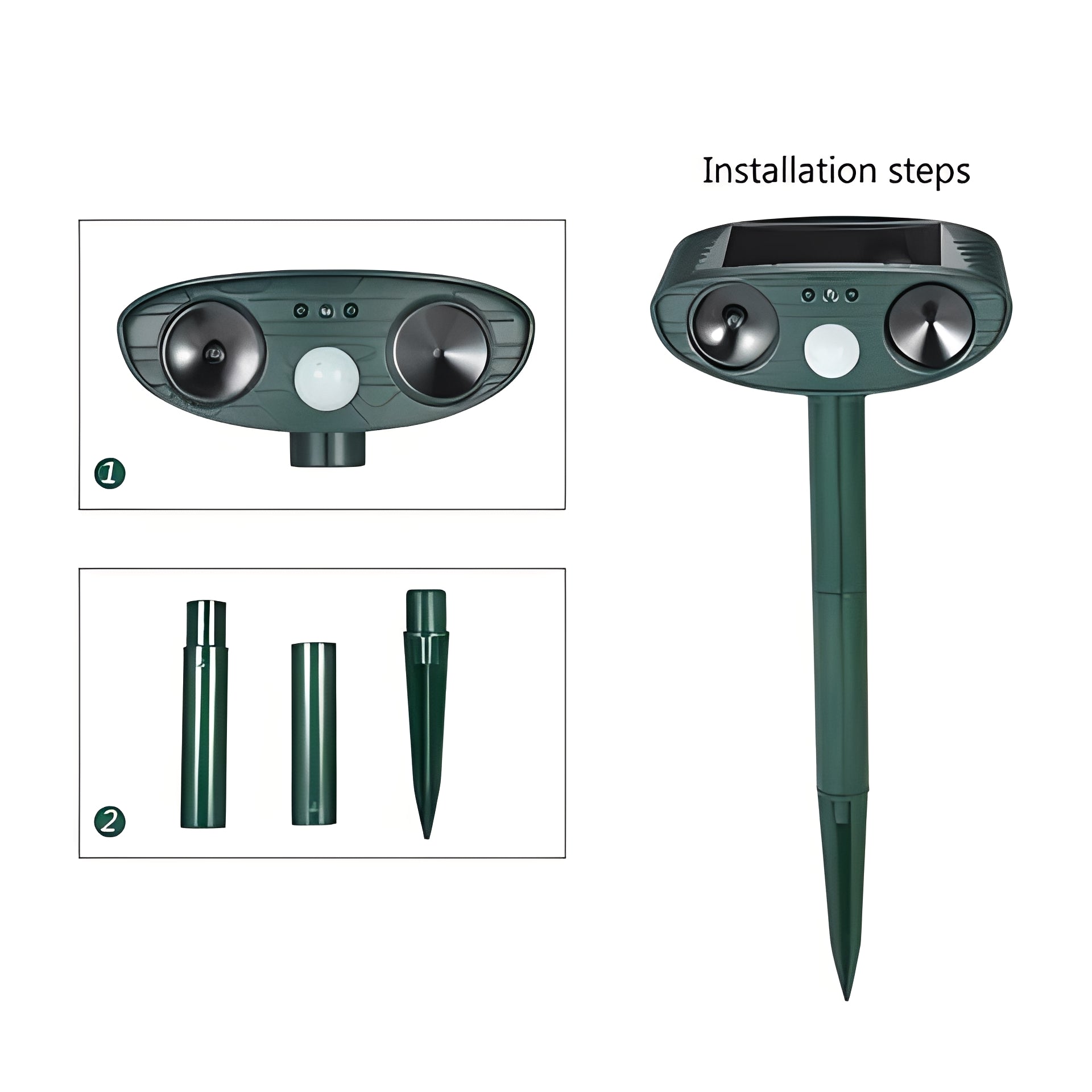 This ultrasonic pest device is a motion-activated designed for outdoor use. It is intended to help discourage animal activity in yards or gardens. When triggered, it produces ultrasonic waves for a short duration. It operates without chemical traps.