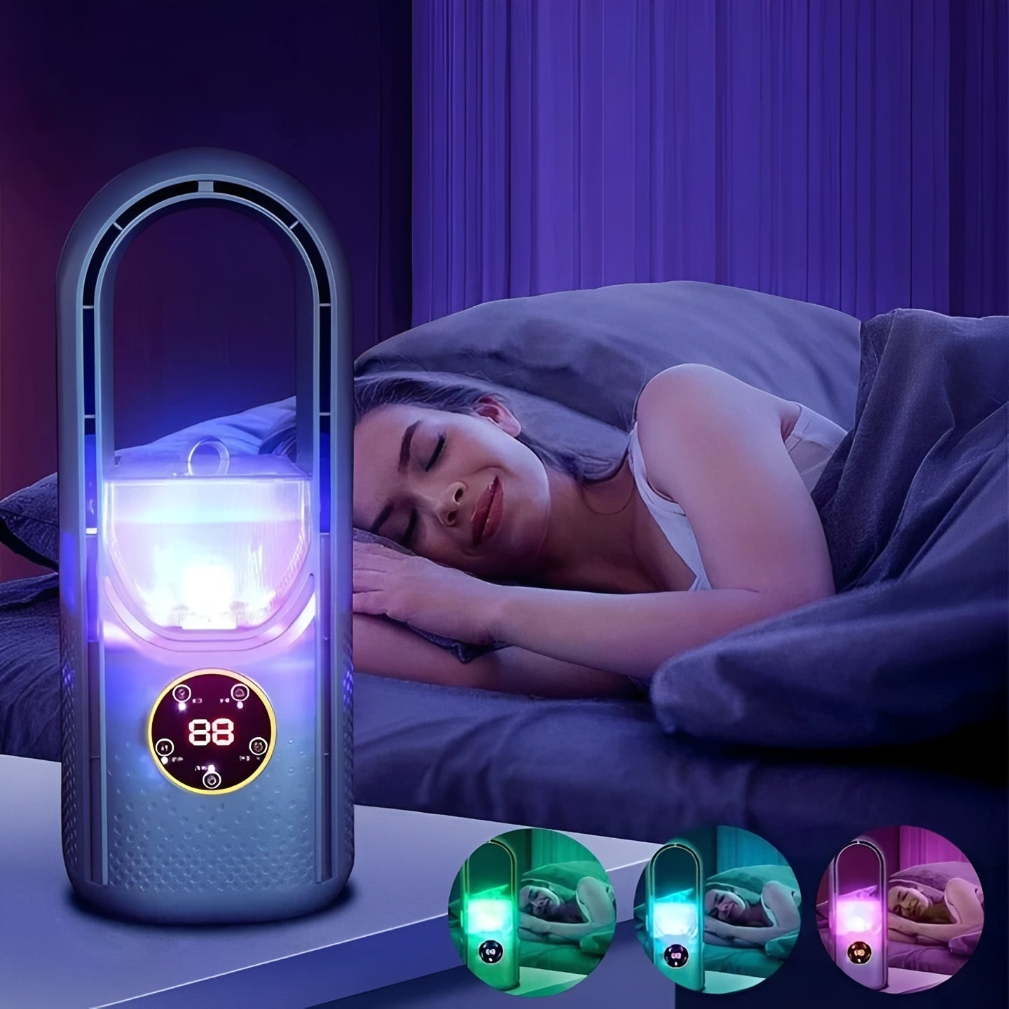 This portable evaporative cooler uses a blade-free airflow design intended to circulate air in indoor spaces. The enclosed structure avoids exposed fan blades. Airflow perception and cooling effect may vary depending on room conditions, humidity, and placement.
