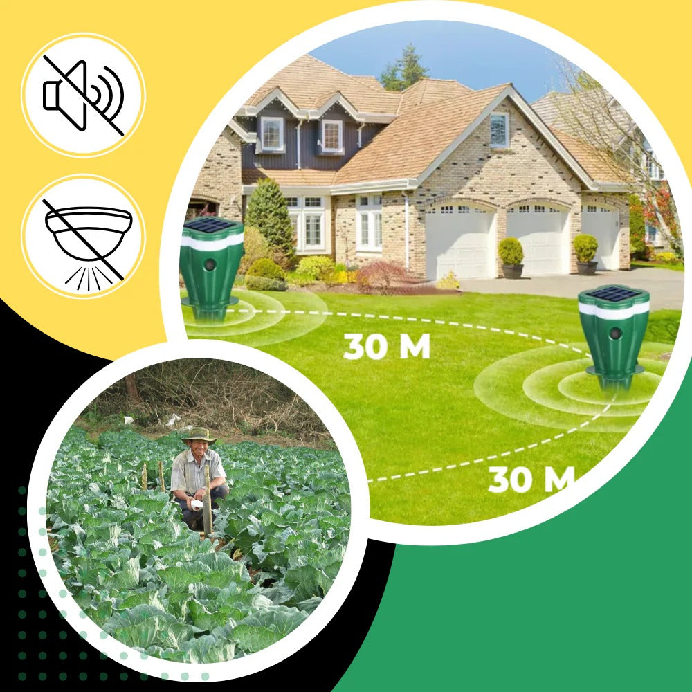 Designed for "set it and forget it" convenience, the repeller features an integrated solar panel that charges an internal battery for continuous operation. It stores enough power to run through the night and during cloudy weather, ensuring your garden is guarded around the clock. Built with a durable, weatherproof green exterior, it blends seamlessly into your landscape while withstanding rain and UV exposure.