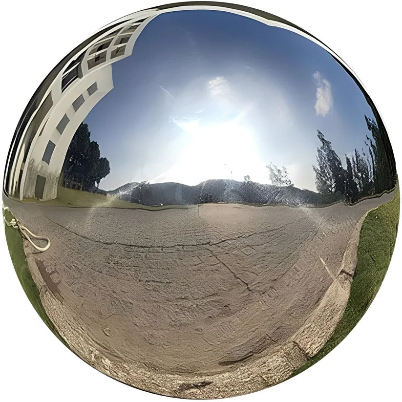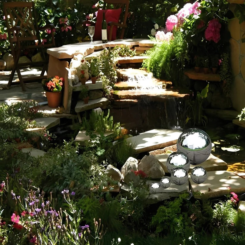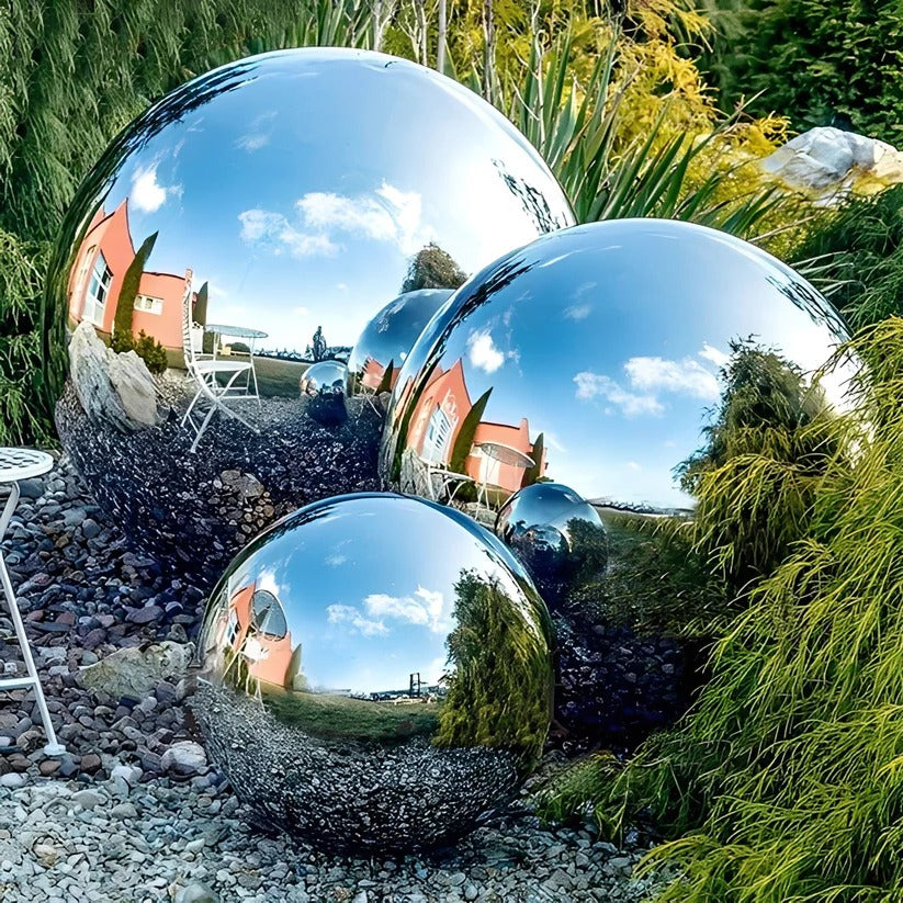 These stainless steel gazing globes are designed with a polished surface intended to reflect surrounding scenery such as plants, sky, and nearby structures. The reflected appearance may change depending on lighting conditions, weather, and placement within a garden, patio, or indoor space. Visual effect and clarity may vary based on environmental factors.