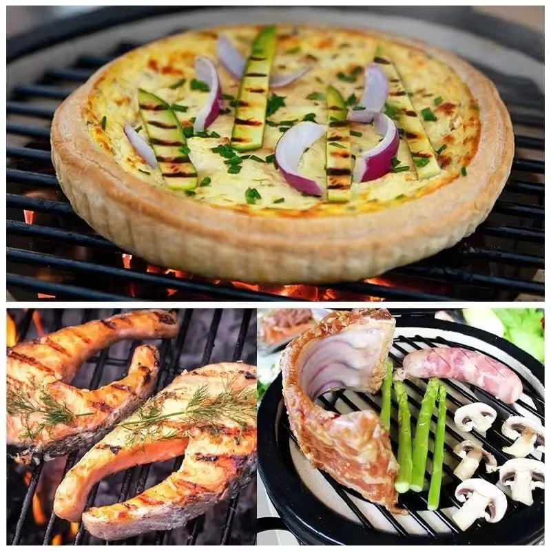 The durable ceramic body is designed for excellent heat retention and even distribution, helping food cook evenly while maintaining moisture. The 13-inch cooking surface provides room for grilling meats, seafood, or vegetables, while its insulated design supports stable temperatures for both quick searing and slow cooking.