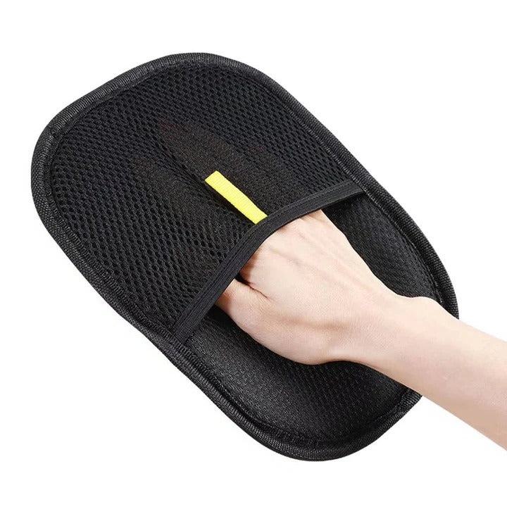 The glove is constructed with an electrostatic fabric that is designed to capture hair. The backing of the glove is a breathable mesh material, and an elastic wrist cuff provides a secure fit during use. Both sides of the glove have textures for grooming.