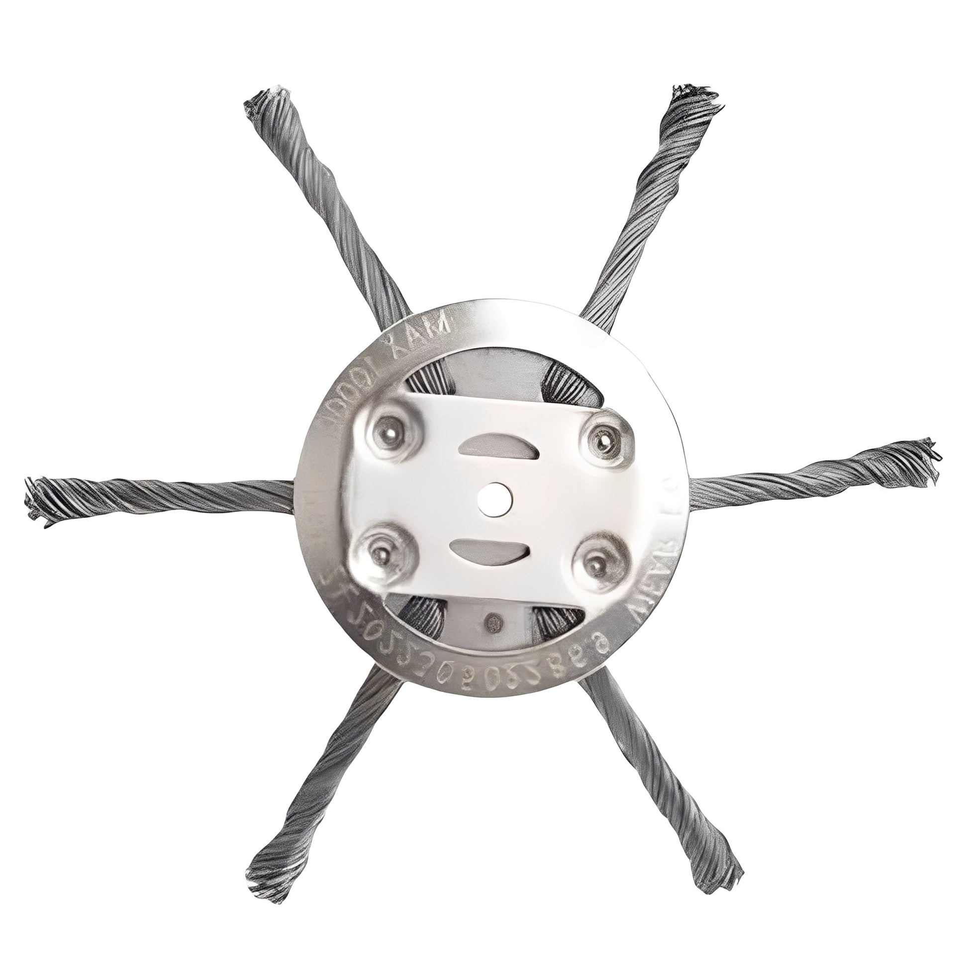 The head is constructed from a stainless steel disc and includes reinforced spring steel wire. This metal construction is designed for repeated use and is suitable for use on areas that include harder surfaces when used with compatible tools. The wire wire structure is shaped to help manage vibration during operation.