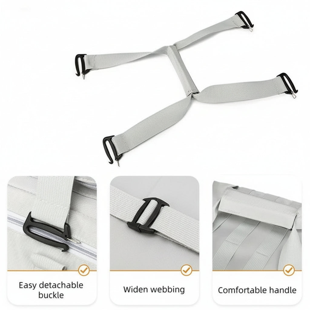It is designed for travel and includes a trolley strap to slide over the handle of a rolling suitcase.
